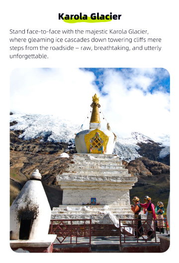 • Marvel at dreamlike landscapes such as Yamdrok Lake and Karola Glacier